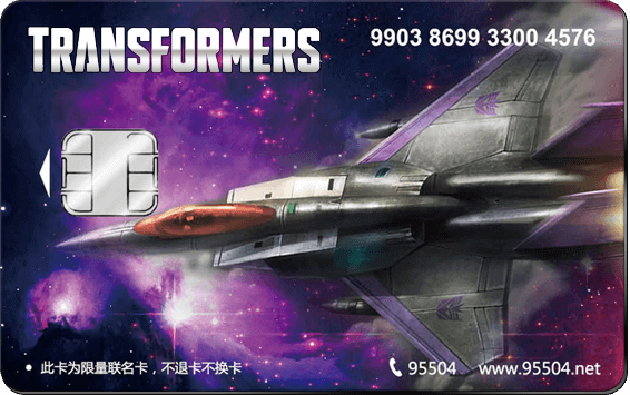 本系列產品人物形象由美國孩之寶公司授權的歐洲設計團隊構思設計,采用黑色鏡面卡基,從而展現了機器人的力量感與酷炫感??颖趁妗盩RANSFORMERS”字樣采用獨特的立金技術,均由手工粘貼而成,每一張卡都是獨一無二的,同時配以高端白金信用卡使用的稀有銀色芯片,這些都使其更具科技韻味。
