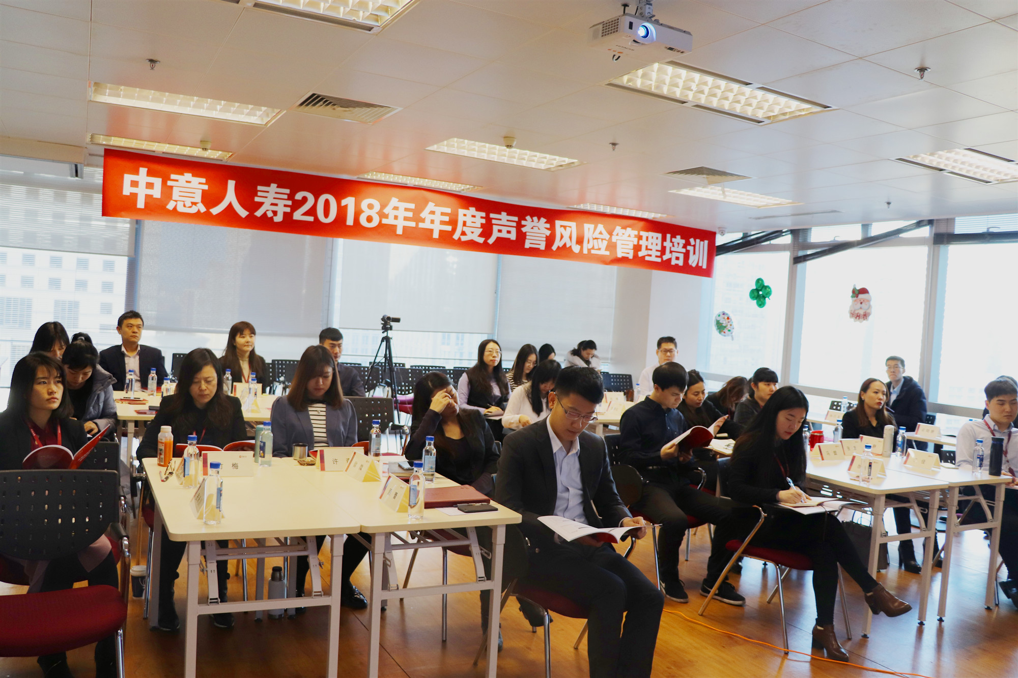 12月28日,中意人壽總經辦聯合中國保險行業協會共同舉辦了“中意人壽2018年年度聲譽風險管理培訓”,此次培訓系中國保險行業協會組織的首期聲譽風險管理定制培訓班,來自各部門及分公司的相關負責人及業務骨干共計80余人參與了此次培訓。