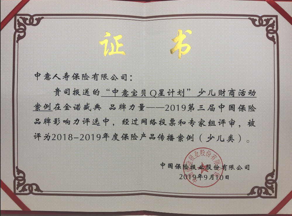 2019年9月10日,由中國保險報業(yè)股份有限公司主辦的,“品牌年輕化之路——2019 中國保險品牌影響力論壇”在京舉辦,經(jīng)過專家評審和網(wǎng)絡投票,我司報送的“‘中意寶貝 Q 星計劃’少兒財商活動”入選 2018-2019 年度保險產(chǎn)品傳播案例。