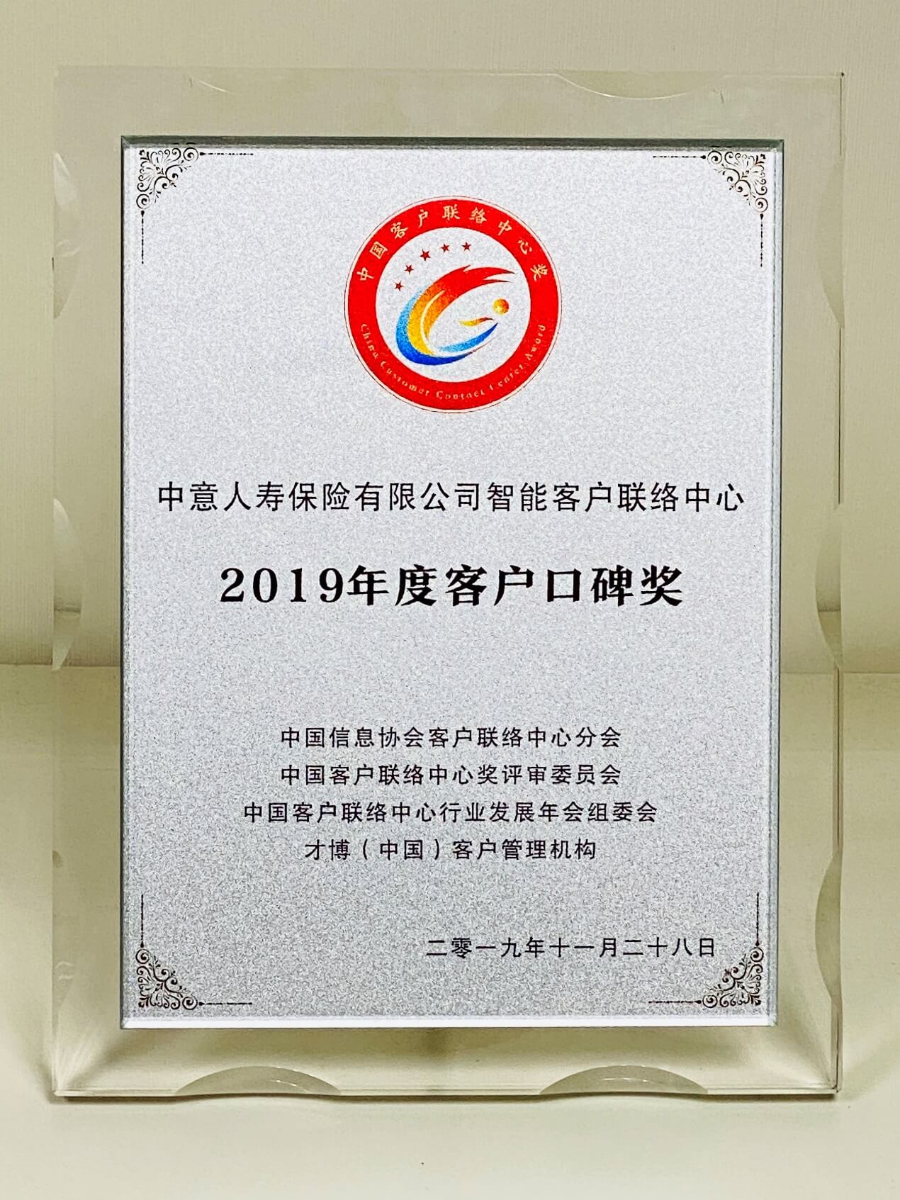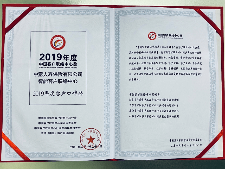 【新聞】中意人壽智能客戶聯絡中心榮獲“2019年度客戶口碑獎”