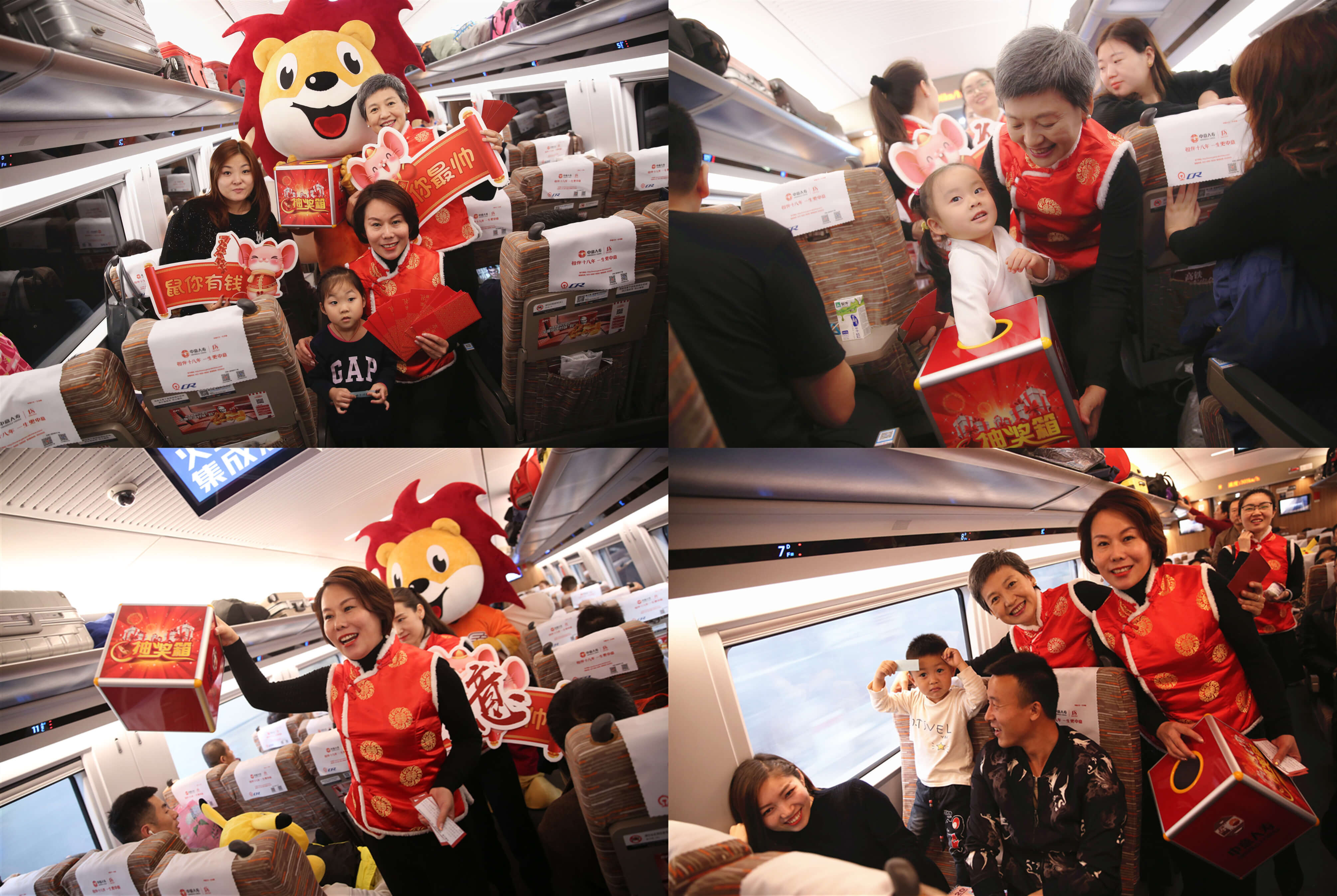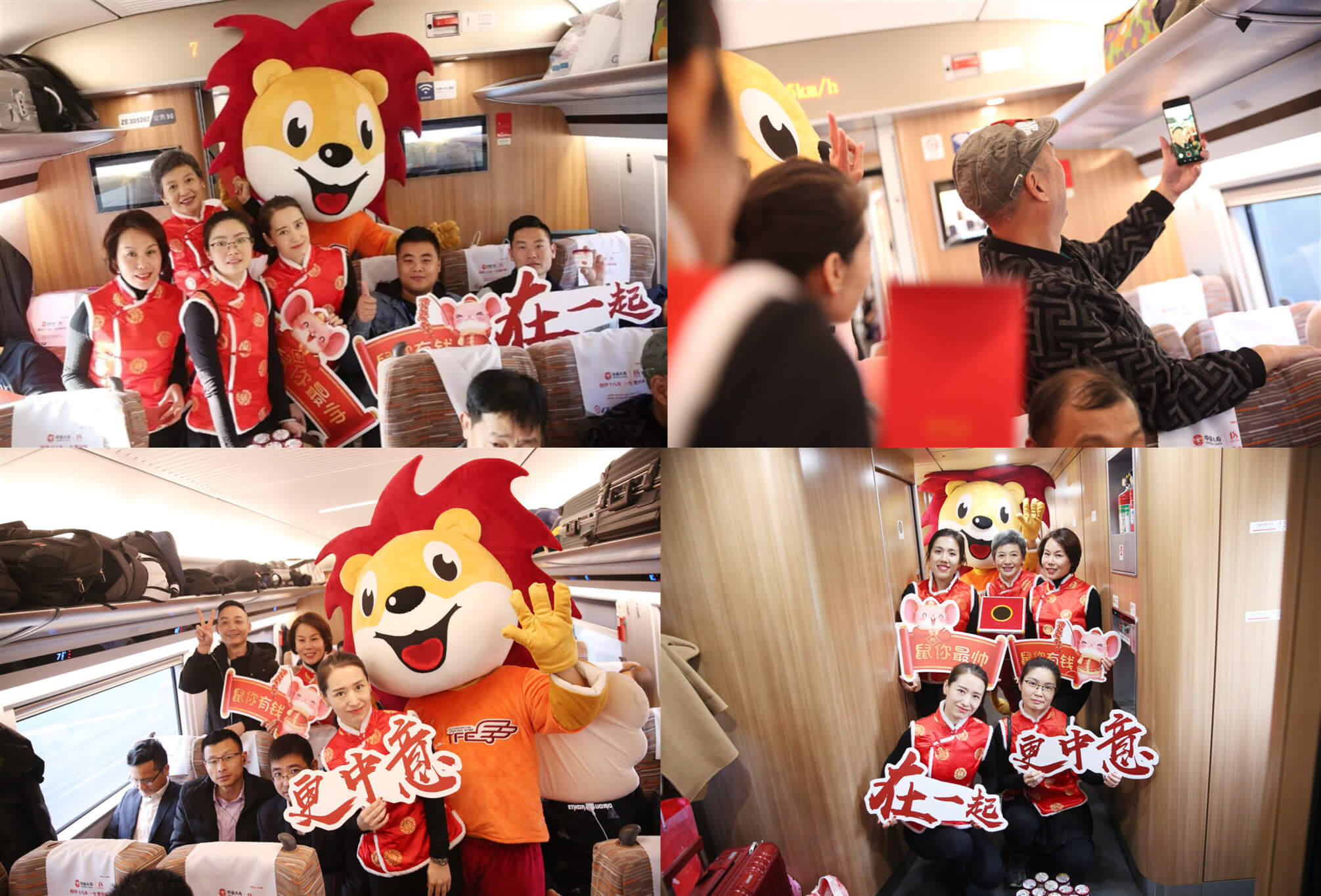 1月8日,從廣州南站準(zhǔn)時(shí)發(fā)車的G72次列車上,中意人壽送福小分隊(duì)閃亮現(xiàn)身,將新年祝福和驚喜送到了乘客身邊。“各位旅客朋友們,大家好,歡迎乘坐中意人壽冠名的品牌列車。美好旅程,中意相伴,祝福大家鼠年有’鼠’不盡的中意”親和力十足的中意人壽優(yōu)秀代理人用簡單溫馨的開場白拉開了中意人壽高鐵“抓福氣 過新年”活動(dòng)的序幕。