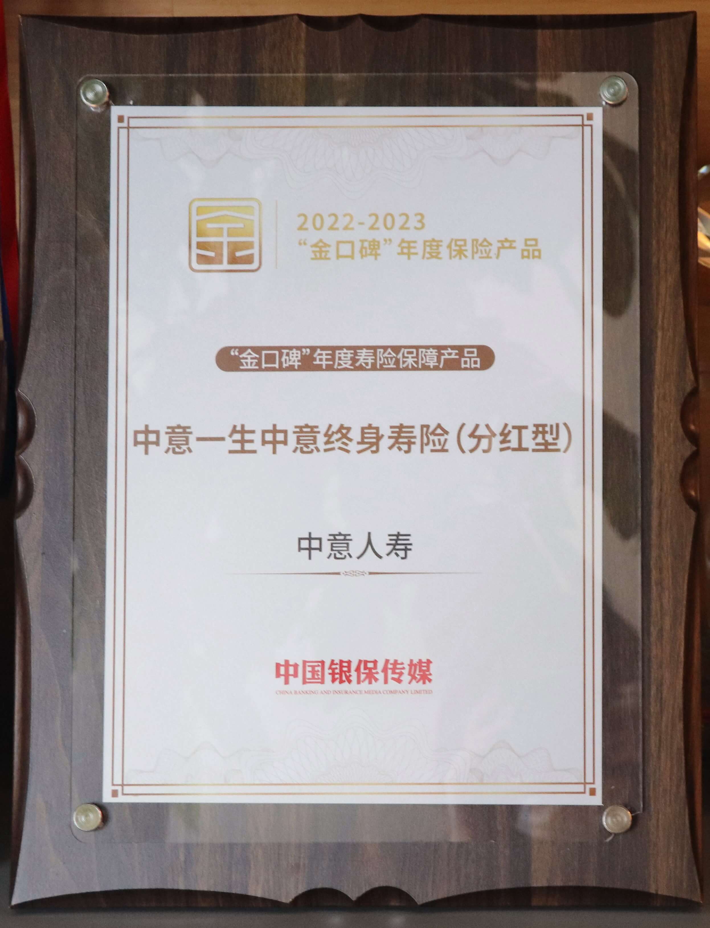 近日,由《中國銀行保險報》主辦的“守正與突圍——首屆“金口碑”保險產品創新大會”在上海舉行。會上發布了2022-2023“金口碑”年度保險產品入選名單,中意人壽保險有限公司推出的“中意一生中意終身壽險(分紅型)”(以下簡稱“一生中意”),憑借可滿足消費者對人身保障和家庭資產配置多重需求的產品優勢,獲評“金口碑”年度壽險保障產品。