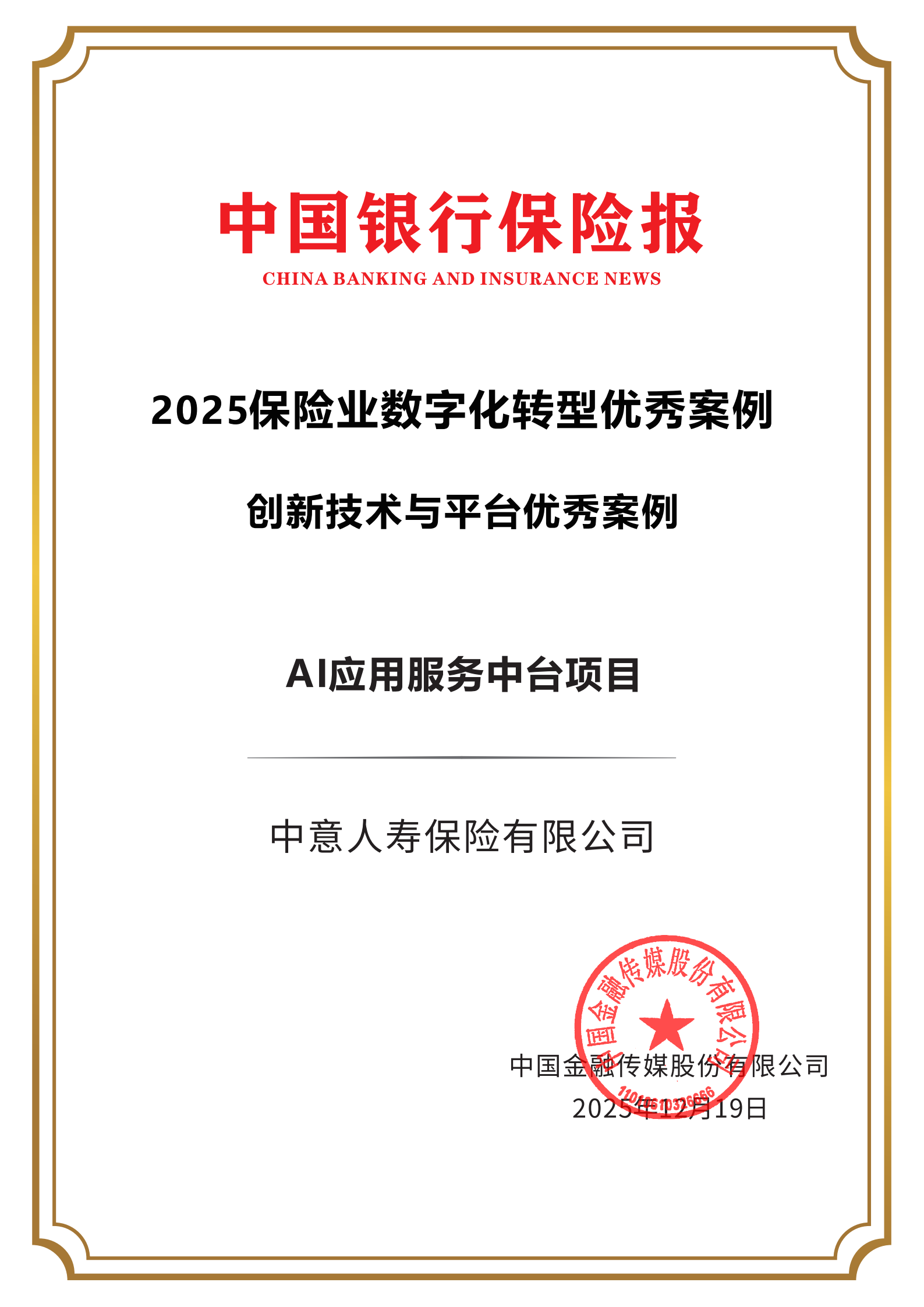 近日,在《中國銀行保險報》主辦的“2025金融業(保險)數字化轉型大會”上,中意人壽自主研發的“AI應用服務中臺項目”憑借鮮明的創新價值與扎實的實踐成效,成功入選“2025年保險業數字化轉型優秀案例”,這標志著公司的科技戰略已從基礎構建邁入多場景賦能的新階段,同時也為行業整體的數字化轉型提供了參考。