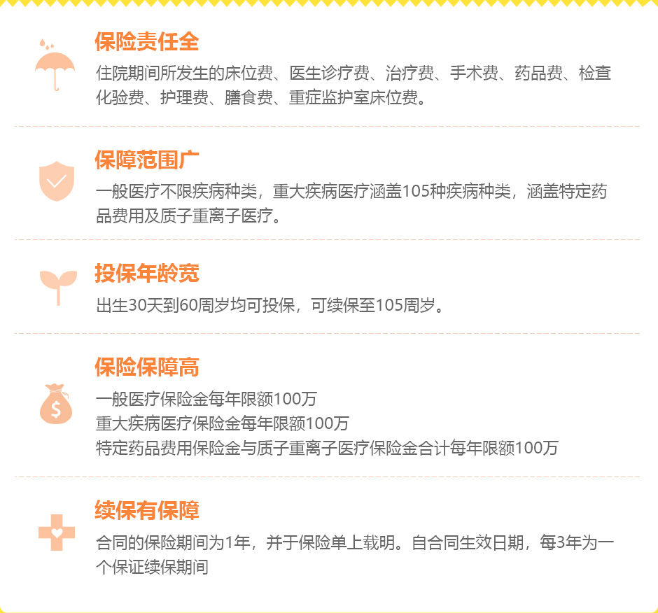 投保年齡:首次投保出生30天-60周歲,最長(zhǎng)可續(xù)保至105周歲